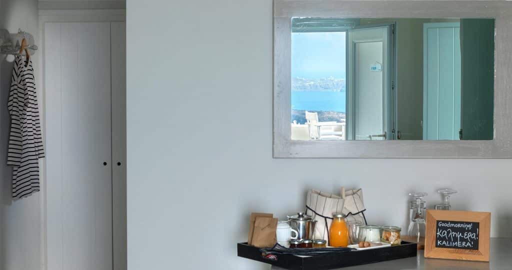 Die Standard-Doppelzimmer haben ein Fenster mit Blick auf die Caldera und die Ägäis. Jedes Zimmer hat direkten Zugang zu einer geräumigen gemeinsamen Veranda und einen atemberaubenden Blick auf den Vulkan und die Klippensiedlung Firostefani.